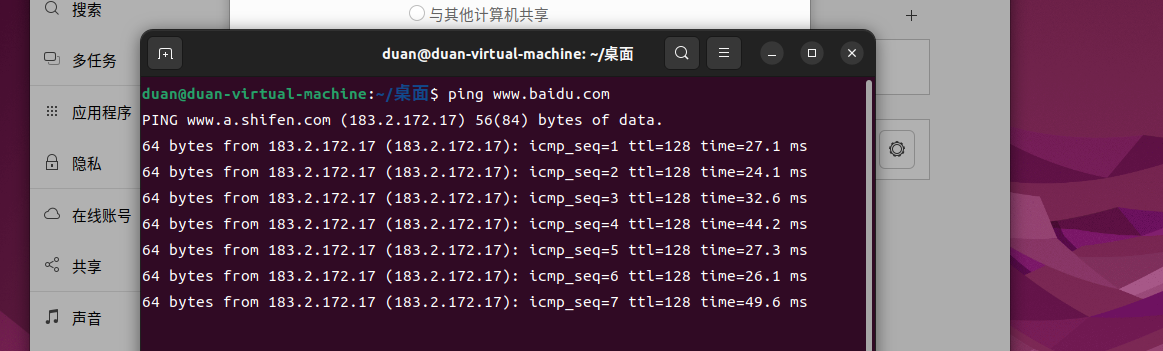 先测试一下ubuntu 的上网功能,pinng下百度