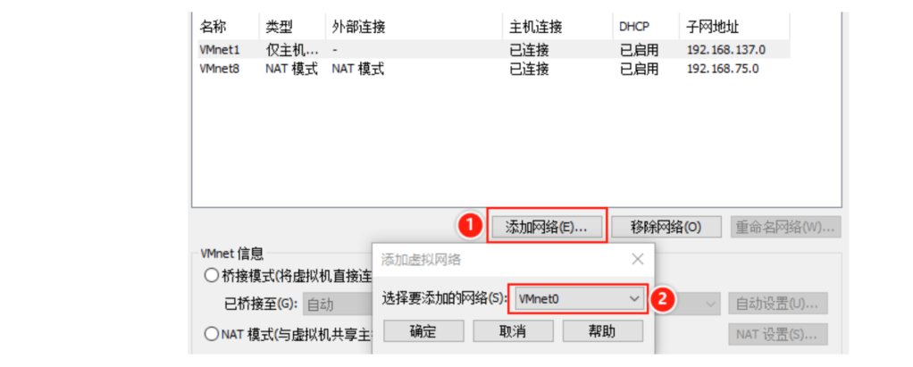 如果此时没有VMnet0,需要我们手动添加: