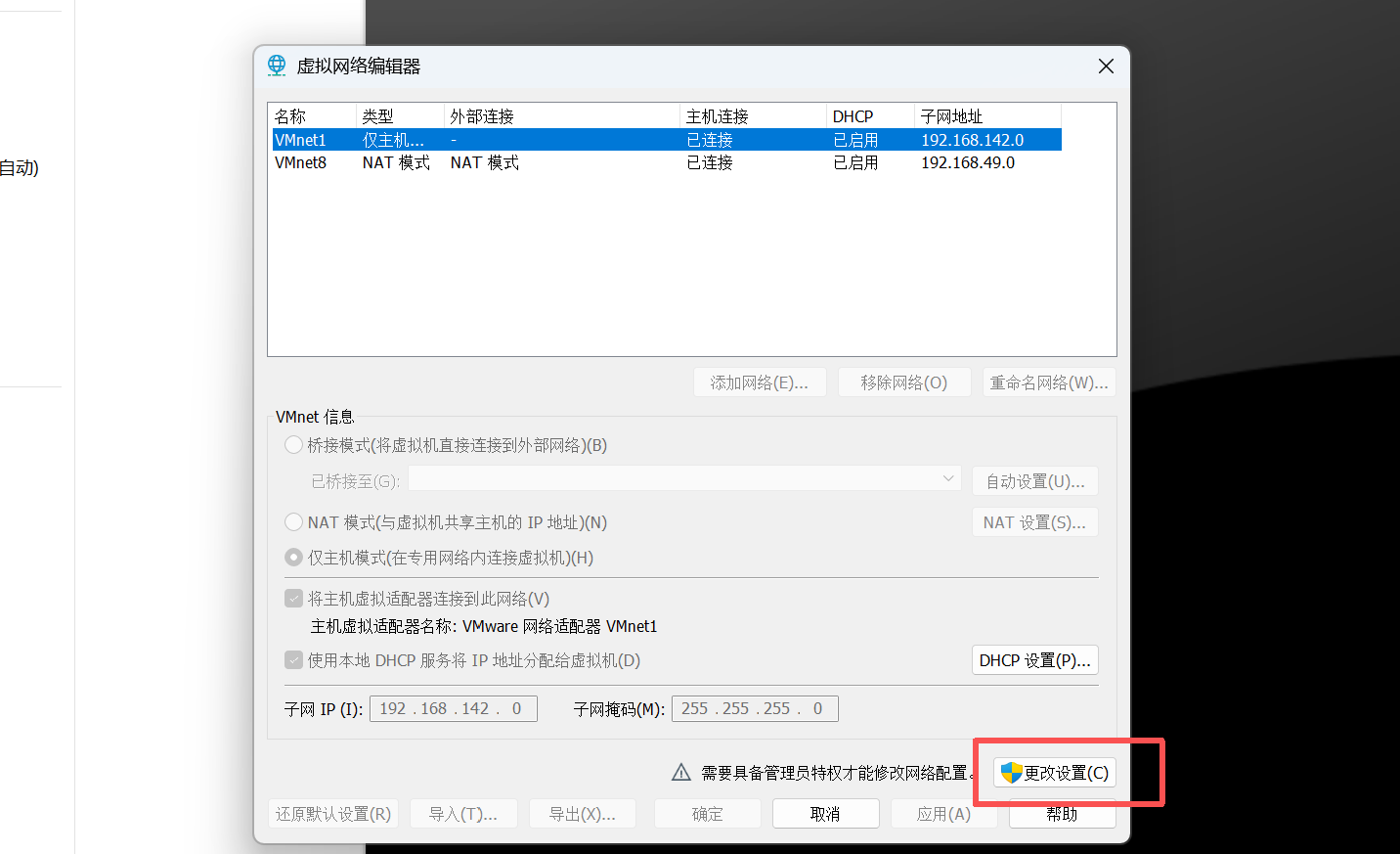 | 以太网适配器 VMware Network Adapter VMnet1 | 192.168.142.1 | 在 host-only 模式下,动态分配虚拟系统的 TCP/IP 配置信息(不涉及我们此次博客) |