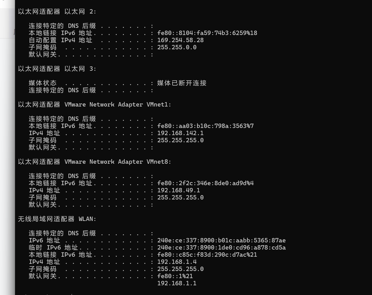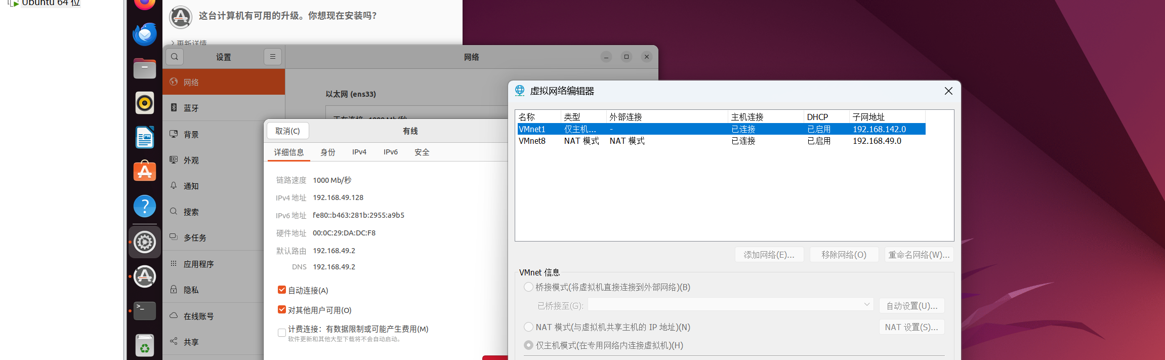 | 以太网适配器 VMware Network Adapter VMnet8 | 192.168.49.1 | 提供 DHCP 服务,用于主机和虚拟机互通,虚拟机上网 |
