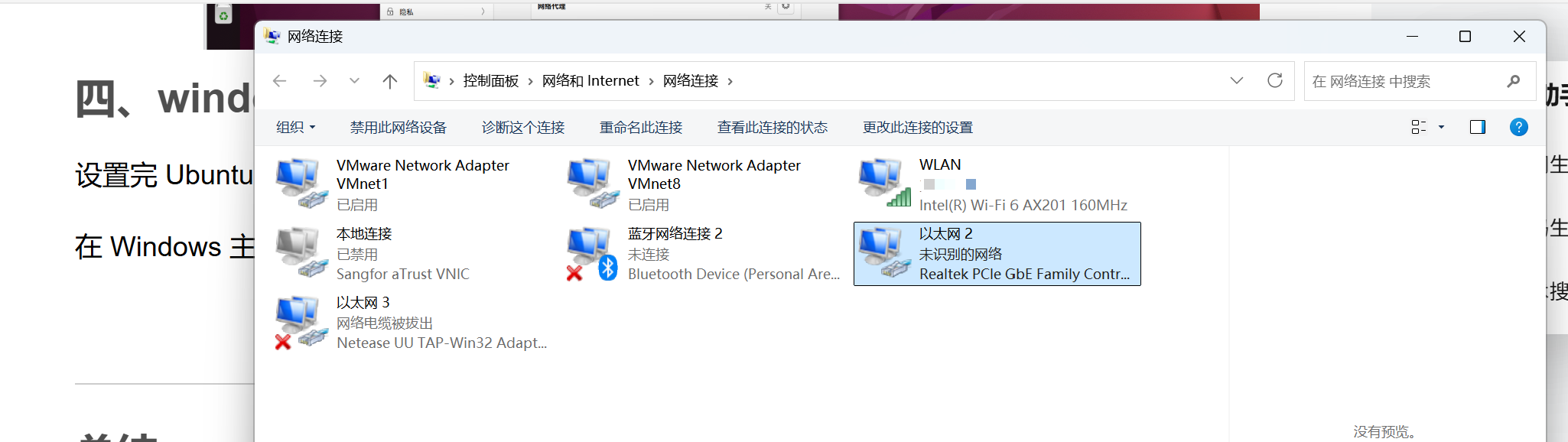 在 Windows 主机打开控制面板 -> 网络和 Internet -> 网络连接,找到以太网。