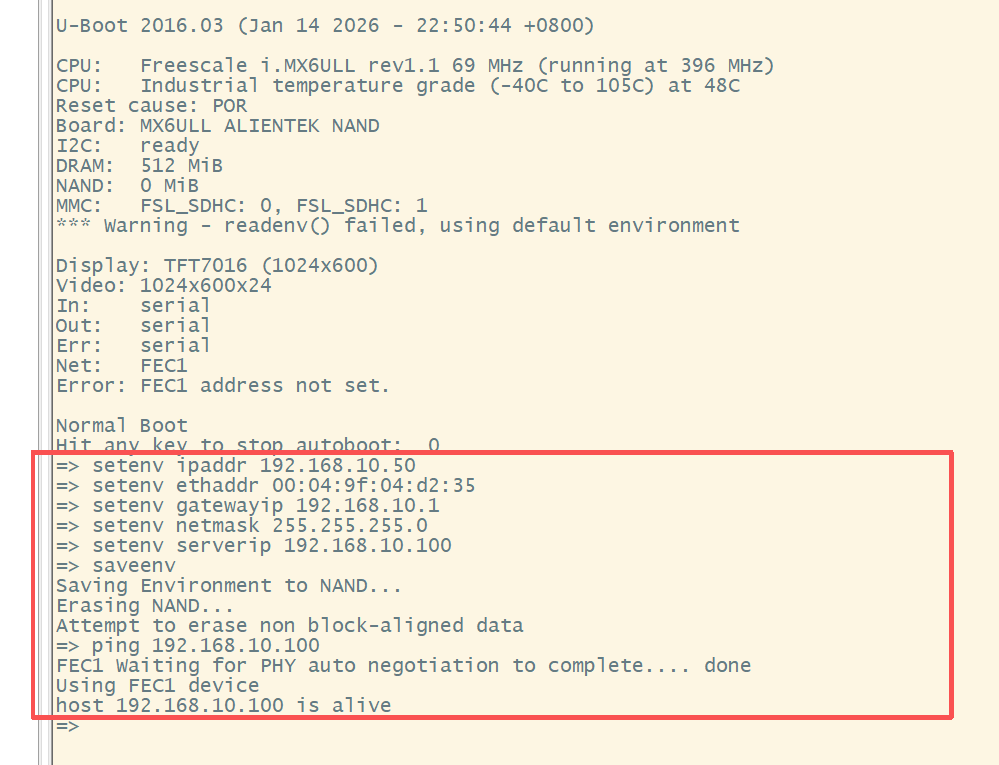 在uboot阶段,使用uboot 命令行设置完开发板 IP 相关的信息后,也能 ping 虚拟机 Ubuntu。