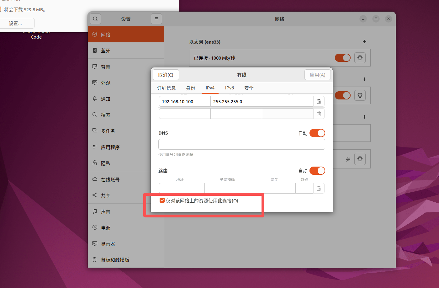 勾选仅对该网络上的资源使用此连接,如下图所示: