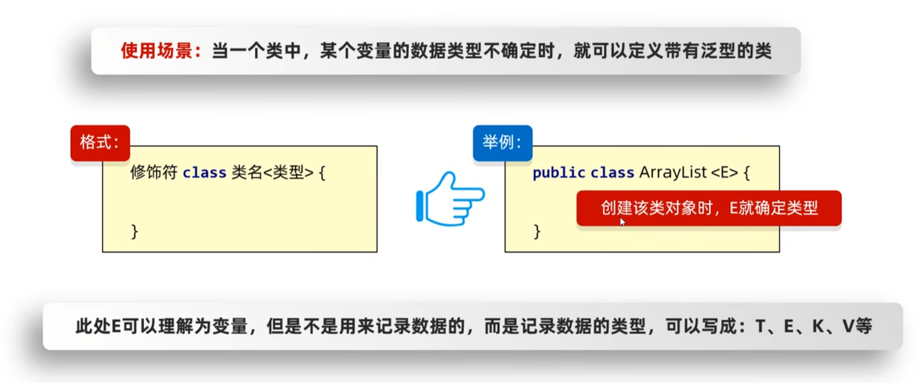 一旦在创建对象后已经确定了E的数据类型,那以后的数据类型都会是这个数据类型