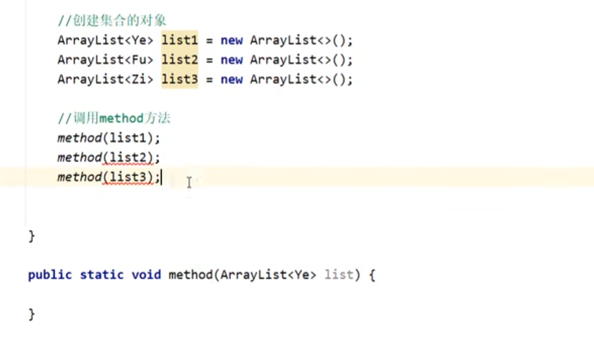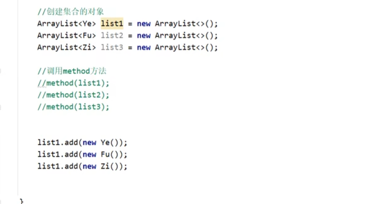 此时分别创建三个类的对象,但由于泛型不具备继承性,所以后两个是不可以添加进集合里的