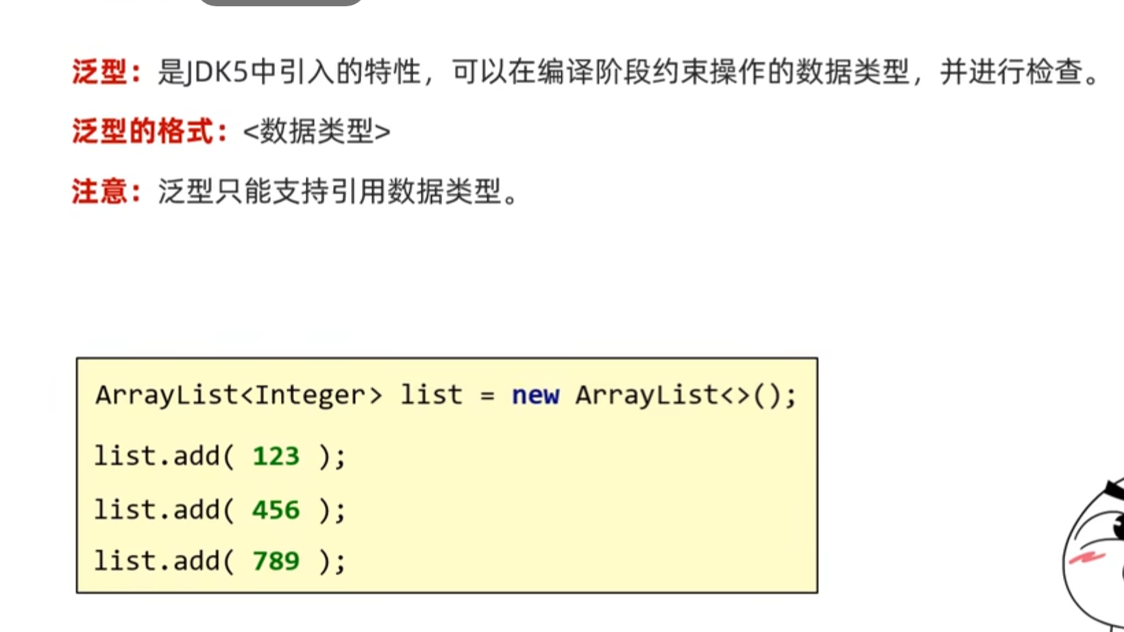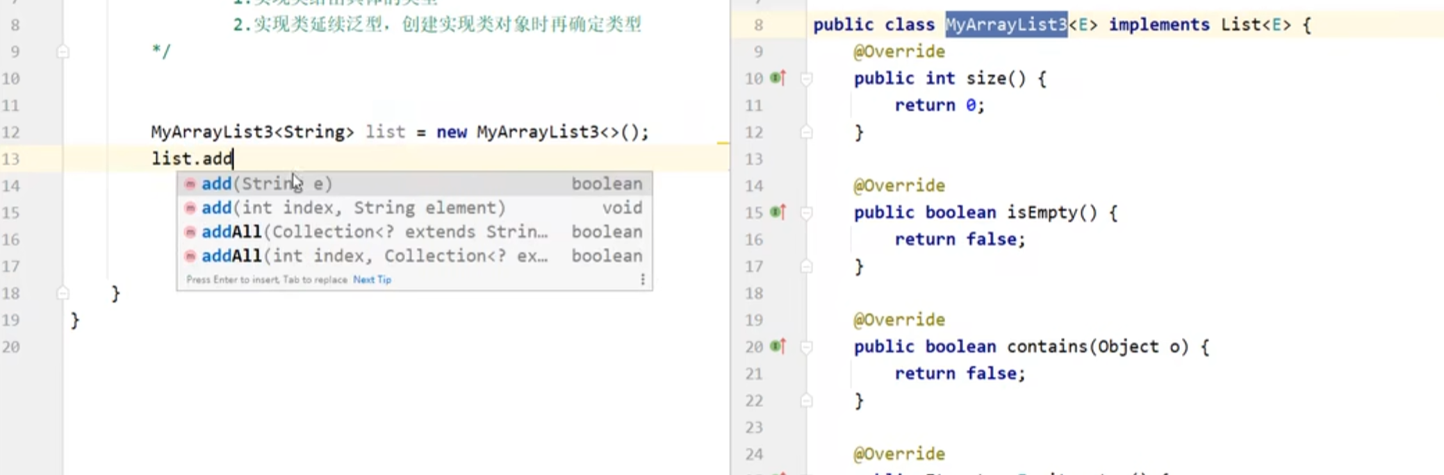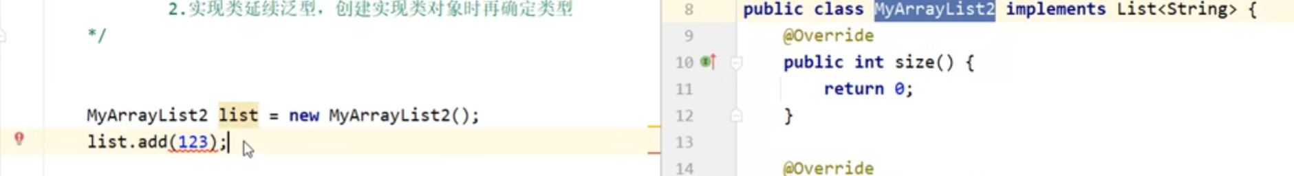 MyArrayList继承了List接口,是这个接口的实现类,泛型写的是string,所以添加数据时只能添加string类型的数据.添加"abc"类的字符串就会报错