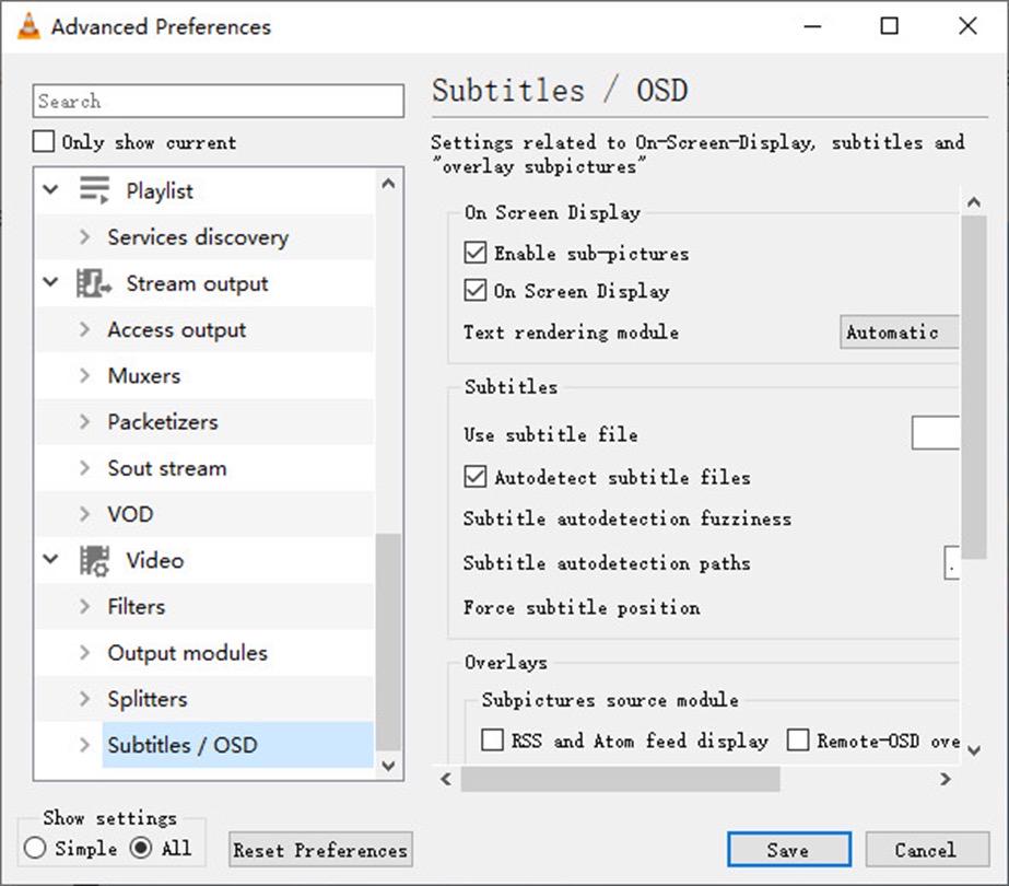 在【字幕 / OSD】中取消勾选"启用字幕",点击【保存】并重启 VLC