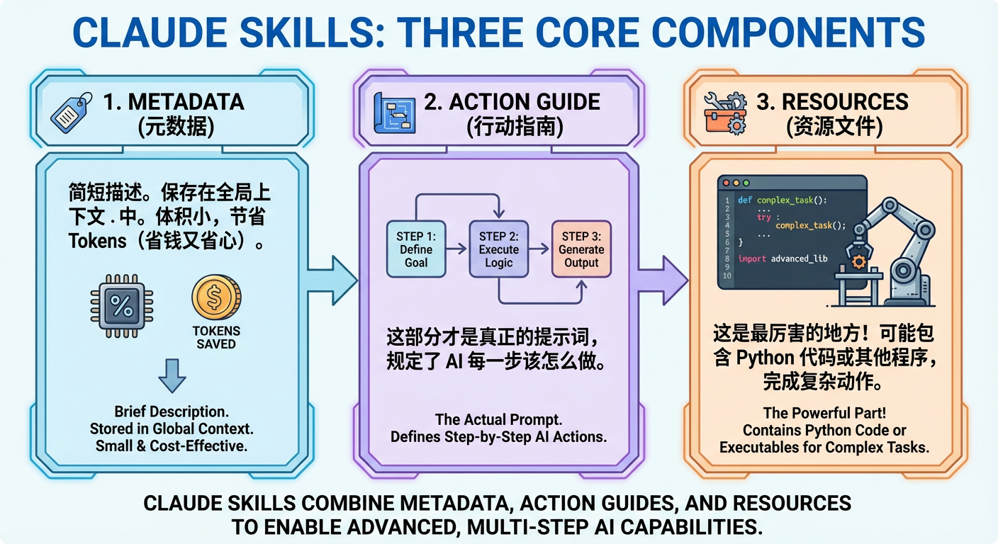 摘要:Skills 并非新概念,而是对提示工程(Prompt Engineering)与工具调用(Tool Use)的系统性封装。它通过元数据、行动指南与可执行资源的三元结构,将大模型能力从"文本生成"延伸至"闭环操作"。