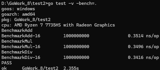 go test -bench=.运行。如果需要查看内存分配统计,需加上-benchmem标志。-benchmem这个参数后面加的时函数名,.表示运行全部测试函数