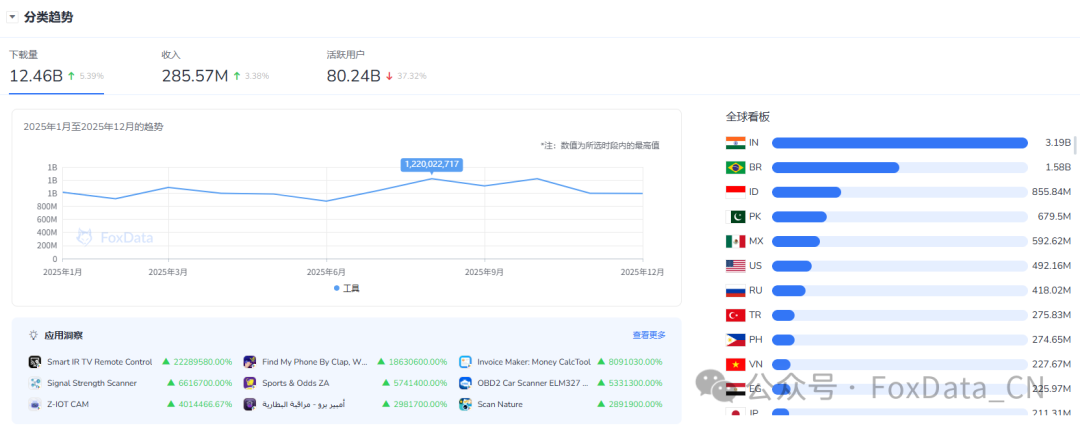 根据灵狐数据(FoxData)分类趋势数据,工具类以124.6亿次下载和802.4亿活跃用户位居Google Play榜首。下载量稳步增长,收入达2.8557亿美元,体现出高流量与高竞争并存的市场特征。主要市场包括印度、巴西和印度尼西亚,巴基斯坦、墨西哥和美国等市场贡献度也在上升。
