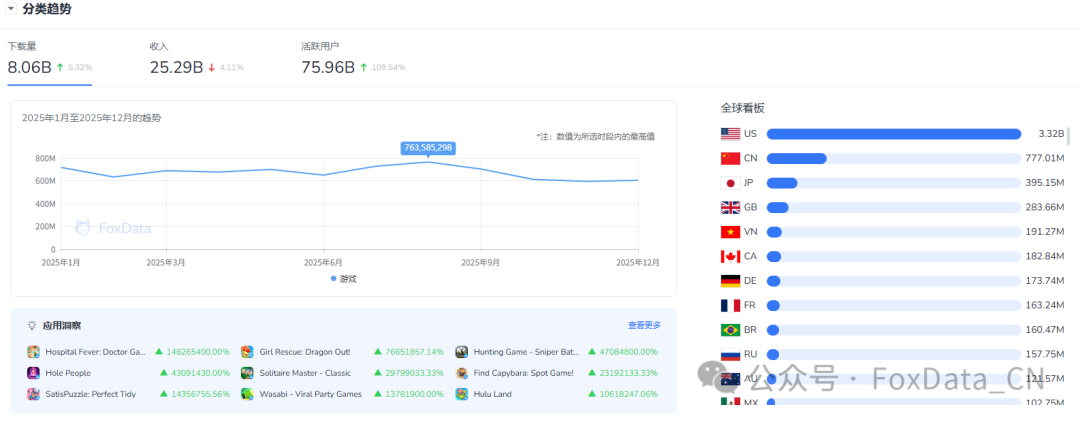 根据灵狐数据(FoxData)分类趋势数据,2025年游戏类在App Store下载量达80.6亿次,活跃用户达759亿。收入增长面临竞争压力,凸显出精准变现、用户互动与留存策略的重要性。主要市场仍为美国、中国和日本,次要增长市场包括英国、越南、加拿大与德国。