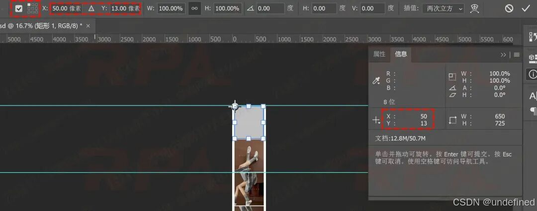 解决思路是:使用PS的自由变换 (快捷键:Ctrl + T),通过调整图片的**缩放比例(H值),**确保图片宽度与矩形宽度一致,在本测试用例中,最终验证可行的高度比例为:H = 164.5%