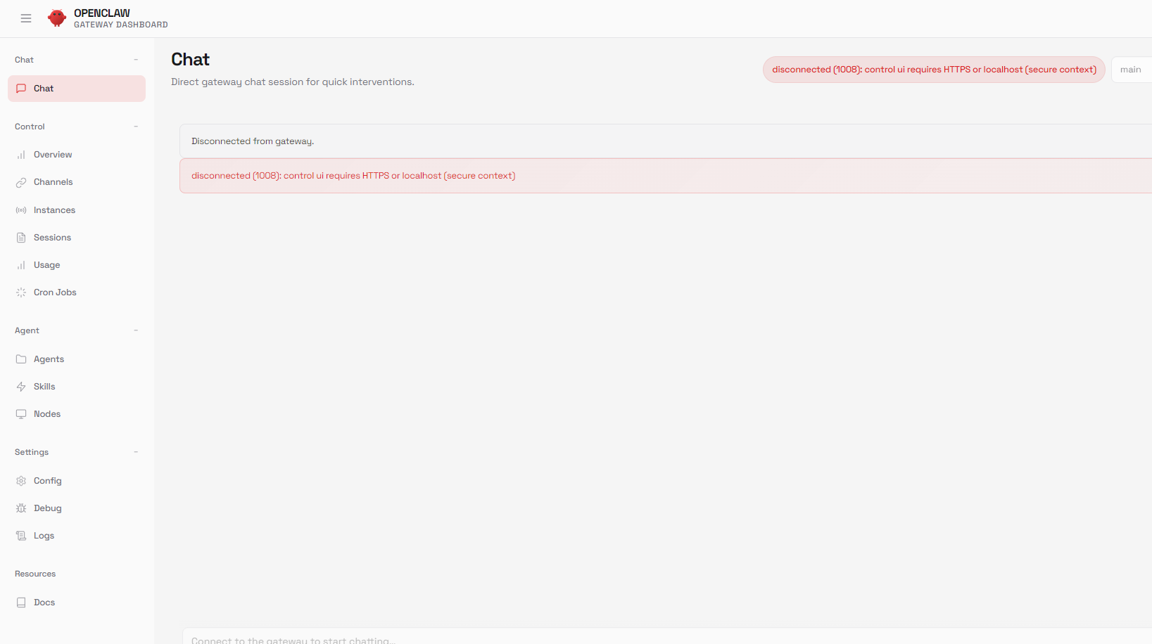 通过http://127.0.0.1:18789就可以访问网关服务了,如果网关因为启动模式启动失败,配置本地模式即可,在~/.opencaw/openclaw.json中添加以下配置