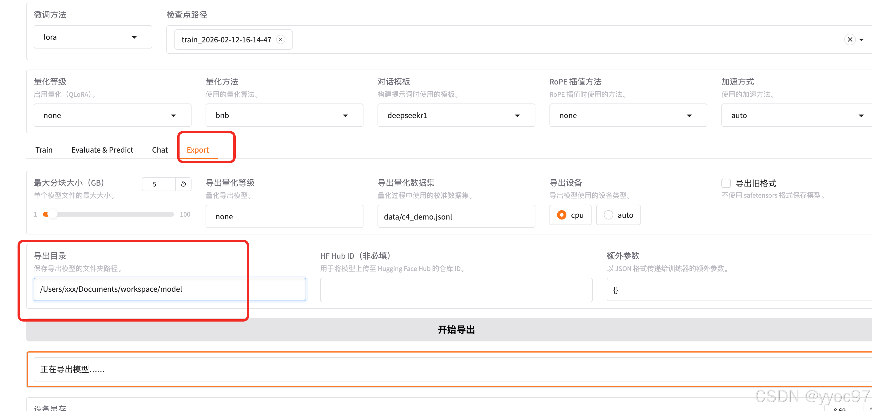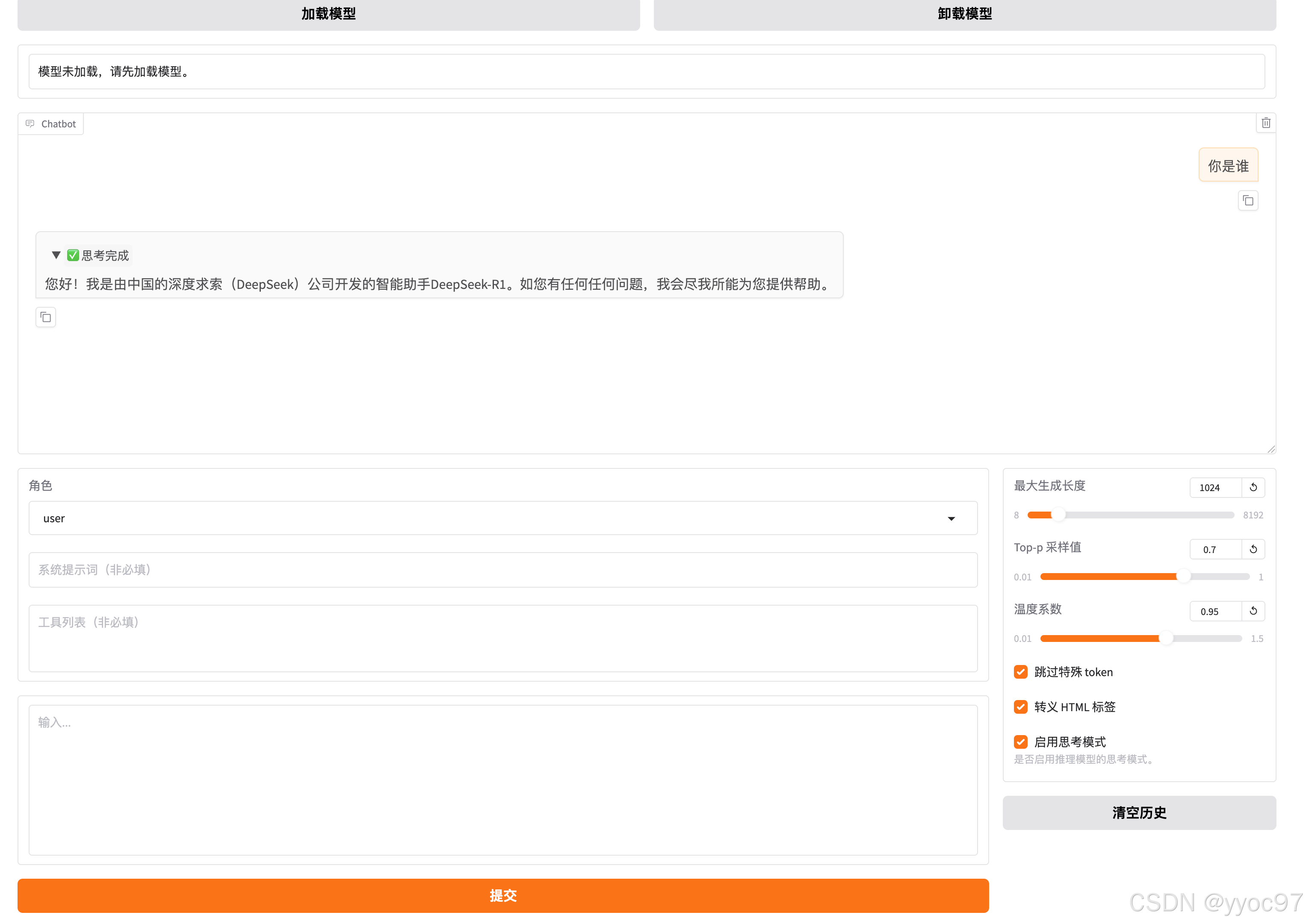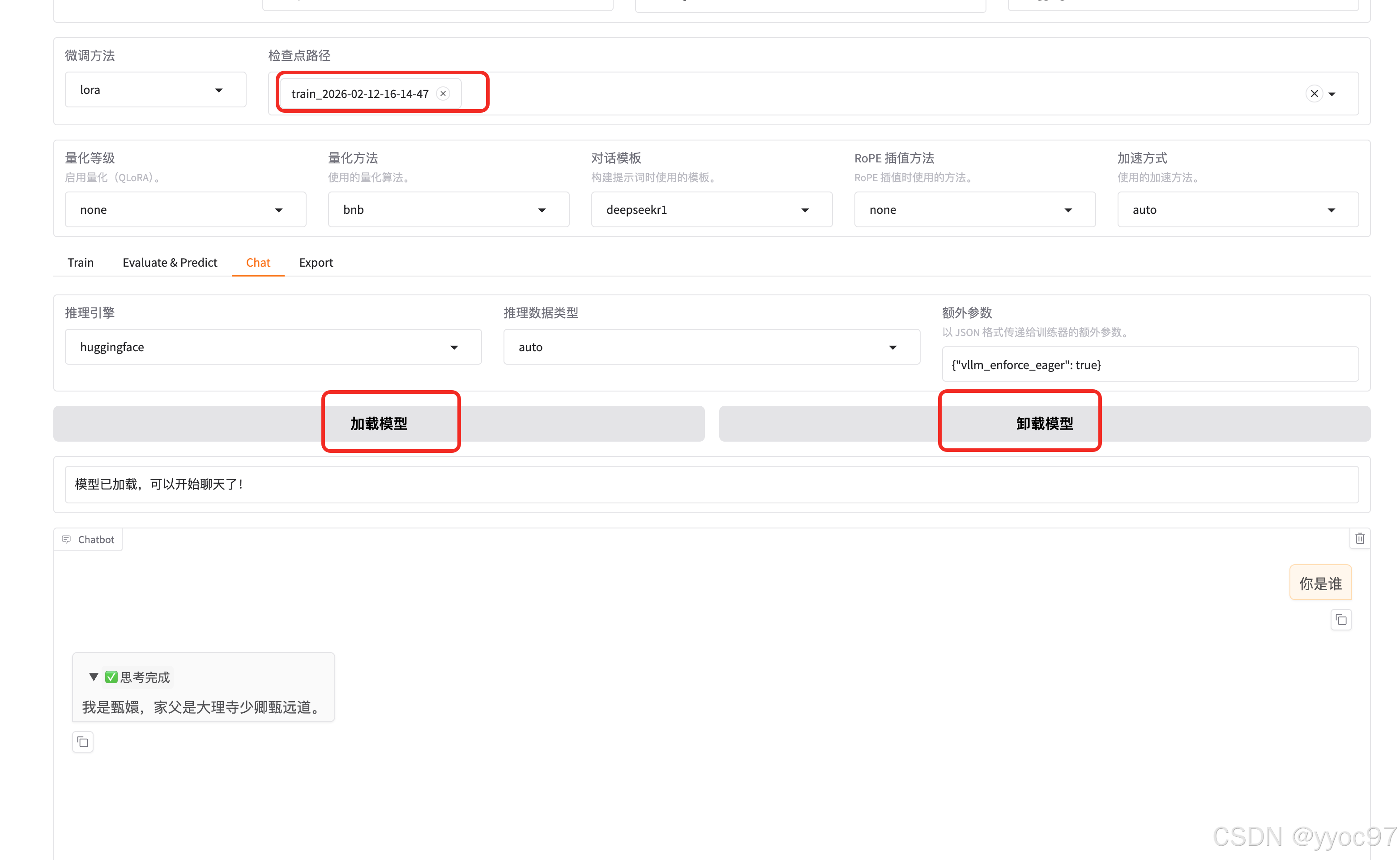 在检查点路径选择我们自己训练后输出的数据集,然后需要先卸载模型,再重新加载。最后在聊天测试"我是谁",它的答案就不是之前的 deepseek深度求索了。