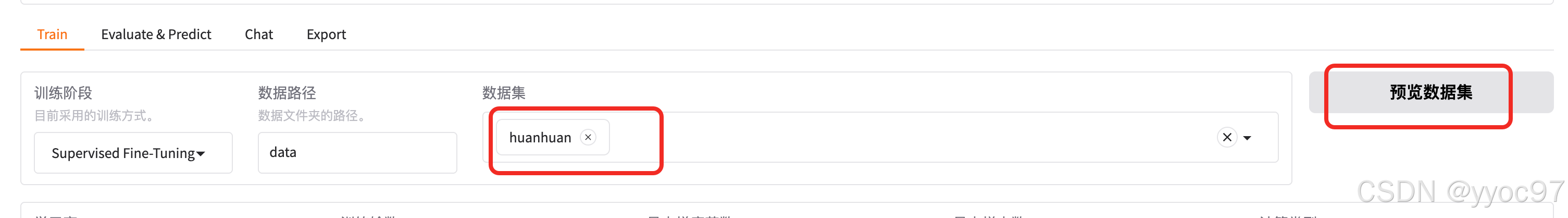 在页面Train中数据集能搜到文件名huanhuan