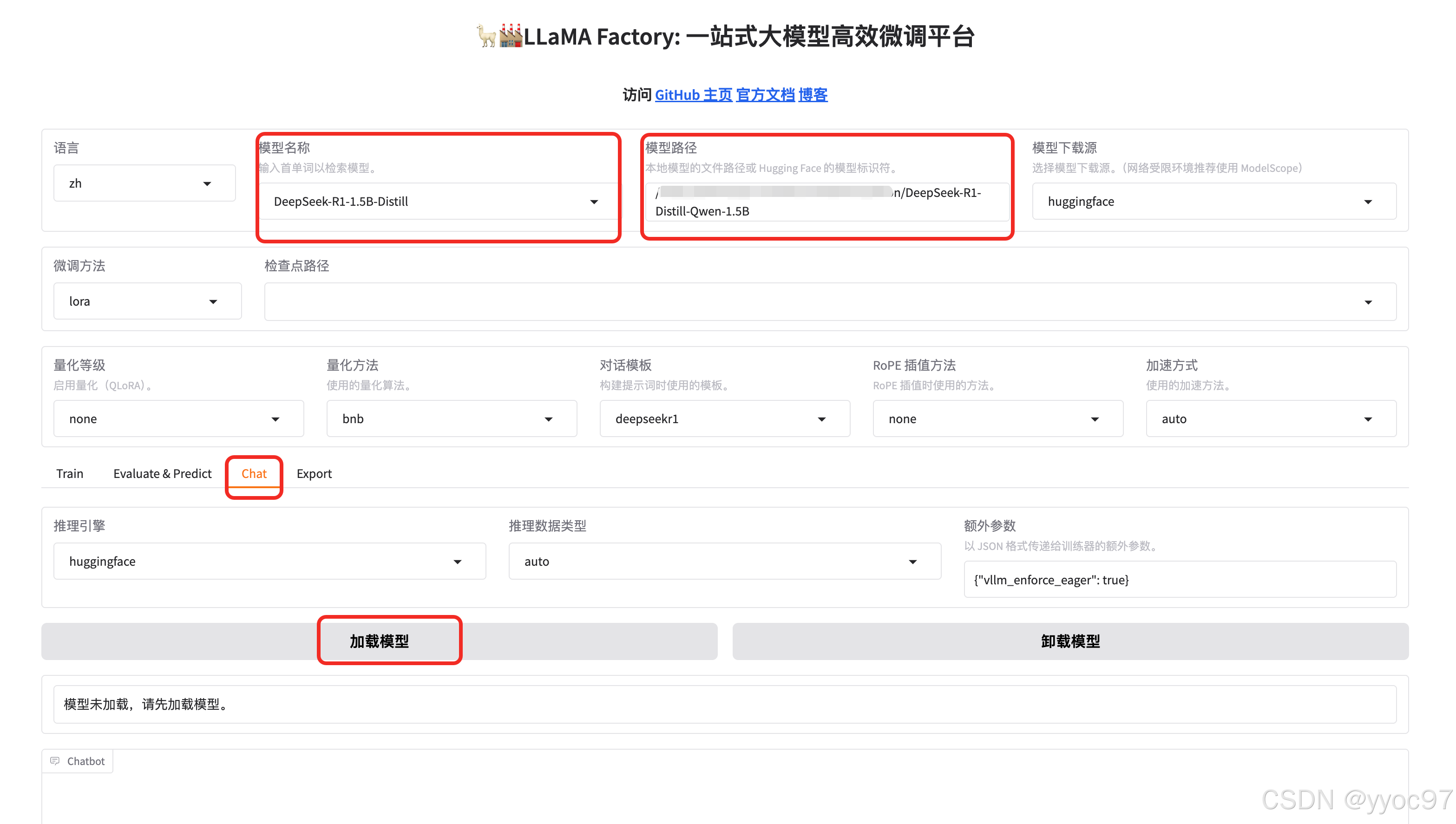 下载完成后可通过页面配置模型名称、路径,然后在Chat中加载模型,进行测试