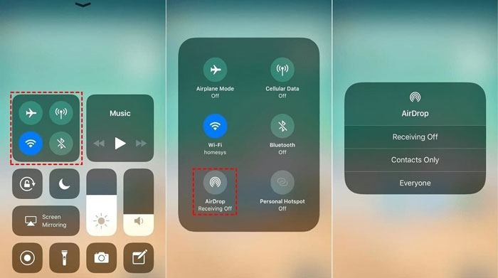 步骤 1. 在 iPhone/iPad 上,从屏幕顶部向下滑动以打开控制中心。确保已启用蓝牙、Wi-Fi 和 AirDrop,并将 AirDrop 设置为"仅限联系人"或"所有人"。( AirDrop"仅限联系人"功能不起作用?)