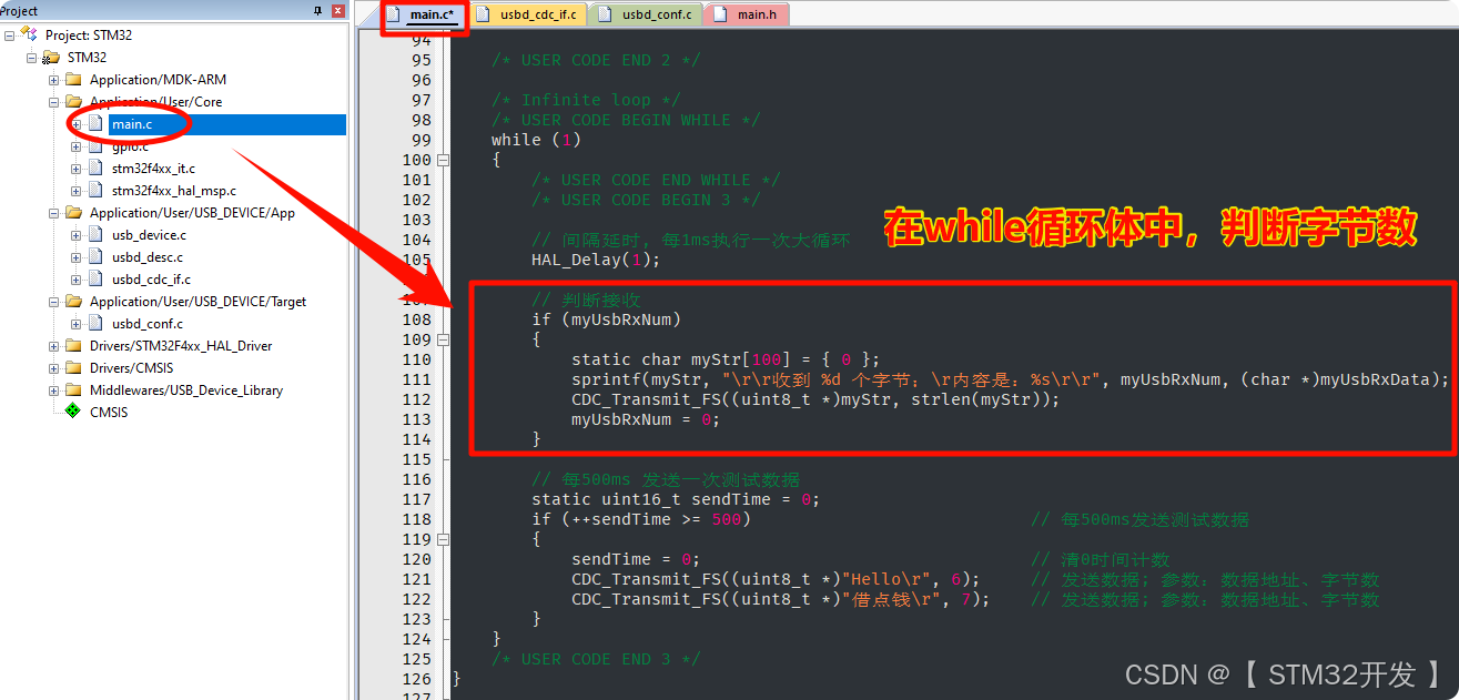 在main.c的while循环中,通过判断myUsbRxNum的值,只要大于0,就表示收到数据了