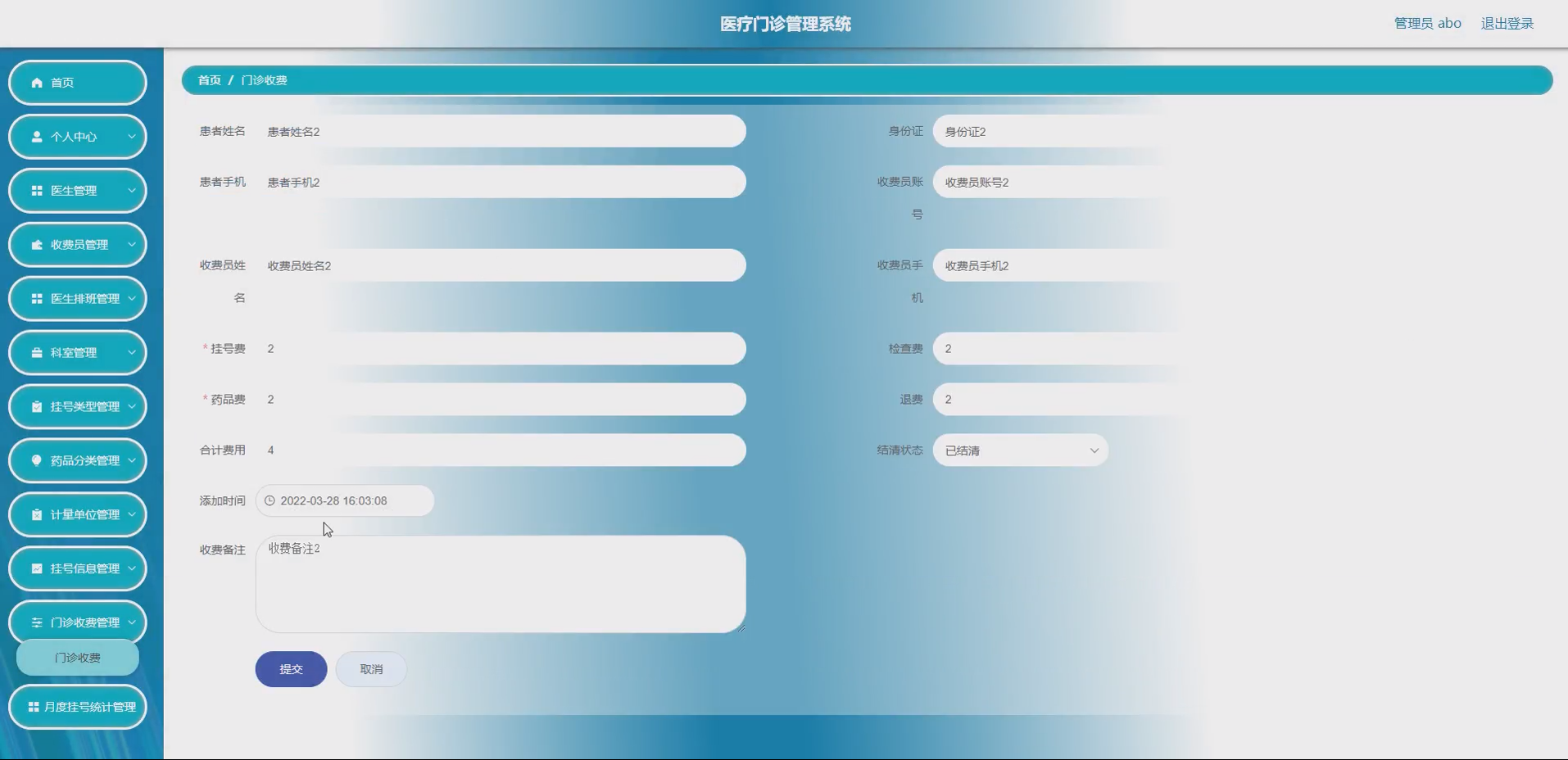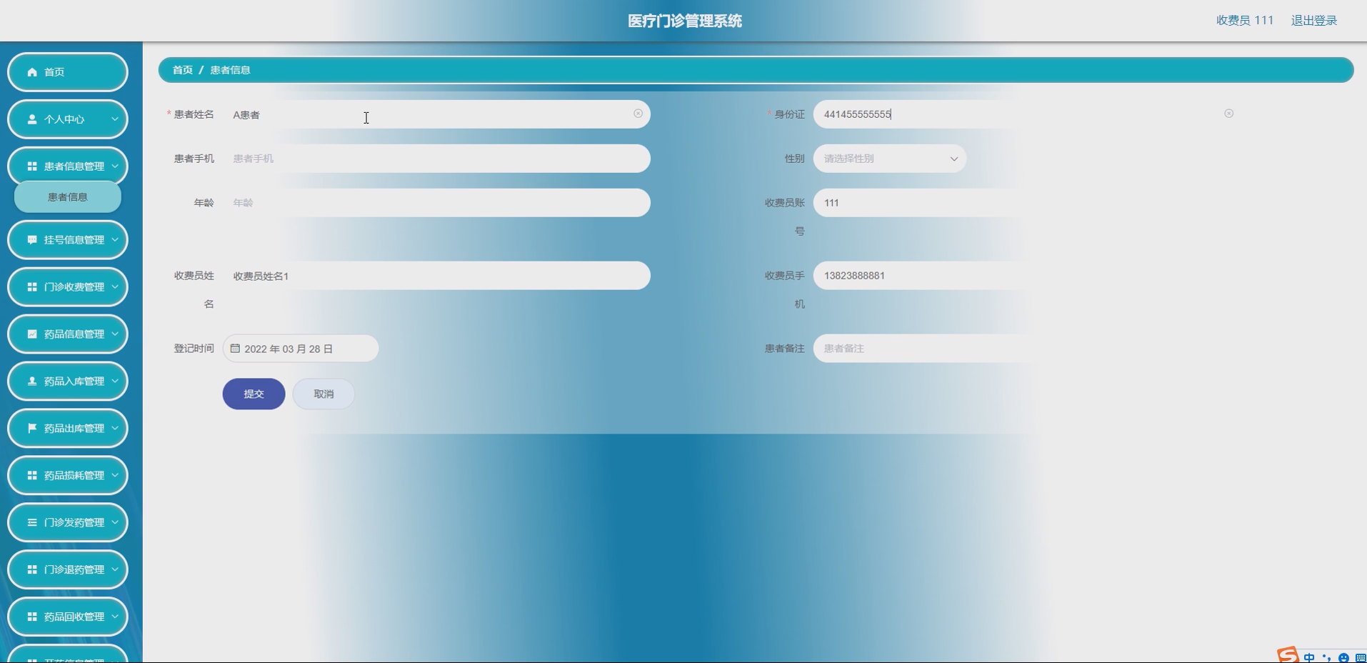 收费员模块:实现收费员信息的录入、修改、删除、查询功能,管理员可管理收费员账号,收费员可进行挂号收费、退药退费操作;