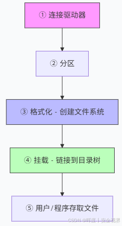 | ① | 连接 | 通过 SATA、USB、NVMe 等接口接入设备 | 系统识别块设备(如 /dev/sda) |