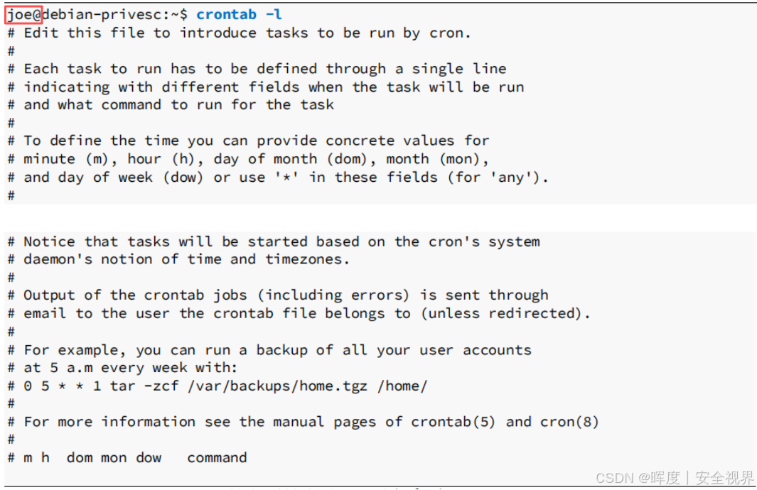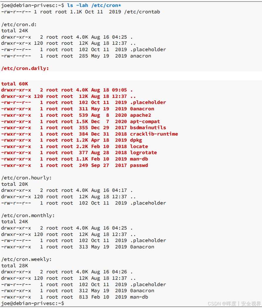 📌 重点关注 :系统管理员经常在 /etc/crontab 文件中添加自定义 的定期任务。应该仔细检查这些自定义任务的不安全文件权限,因为大多数任务以root身份运行。
