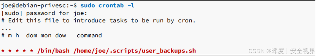 若上述脚本文件(如 user_backups.sh)权限配置不当 (例如:普通用户可写 ),攻击者即可修改脚本内容 ,待下次 cron 自动执行时,恶意代码将以 root 身份 运行,从而实现权限提升。