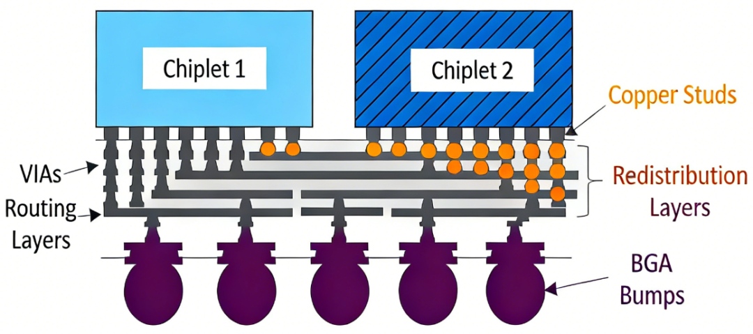 基于芯粒的设计是一种微电子设计与制造方法,即将多个较小的芯片(称为芯粒)组合在一个封装内,形成完整的片上系统(SoC)解决方案。这种方法能够整合制造工艺互不兼容的功能模块,从而提高设计灵活性,并实现不同工艺技术的高效利用。图5展示了基于芯粒的设计实现方式,即两个芯粒在基板上的连接结构。