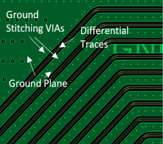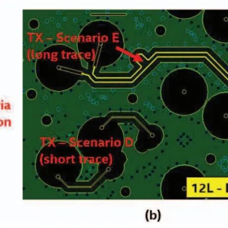 地缝合过孔是在印刷电路板上周期性排列的过孔阵列,用于连接多个层上的地网络。它们有助于减小回路面积,并提供明确的地回流路径。图3展示了地缝合过孔在差分串并转换器(SerDes)走线上的应用。