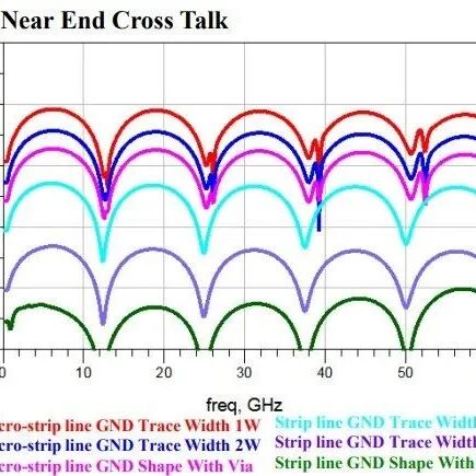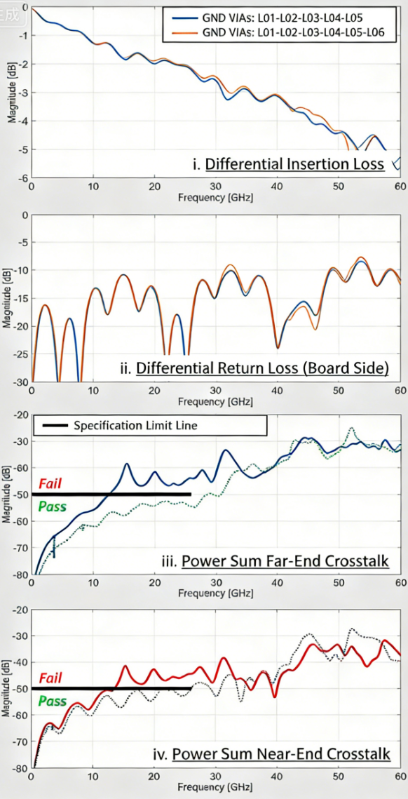 远端串扰和近端串扰的仿真结果表明,当通过地过孔(VIA)连接两个地参考平面,建立明确的地回流路径以抑制谐振时,设计符合规格限制线要求。然而,需要注意的是,差分插入损耗和回波损耗并不总能准确反映地回流路径的质量。因此,至关重要的是,确保印刷电路板上所有与布线走线耦合的结构都具备良好的地连接,尤其是在封装到基板的传输区域,即使基板上已布置地缝合过孔,也需避免地平面出现任何不连续性。