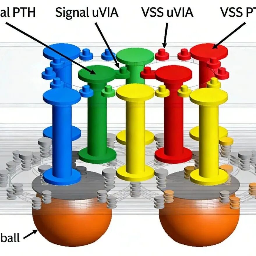 垂直接入互连(过孔,VIAs)用于连接所有地平面结构,在高速串并转换器(SerDes)电路中常被用作地回流路径,以提供低电感、低电阻的地回流通道。过孔(VIA)是一种金属化孔,用于实现印刷电路板不同层之间的连接,允许地回流在各层之间流动,并将各个地平面/电源平面连接在一起。