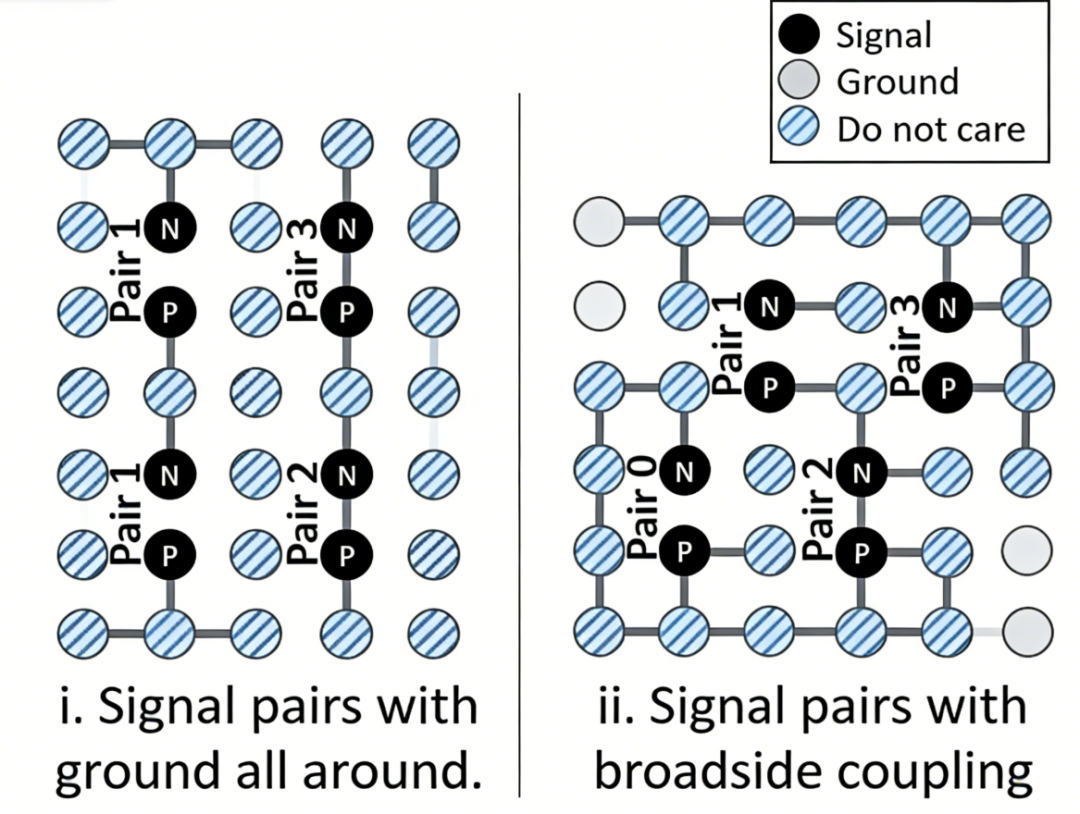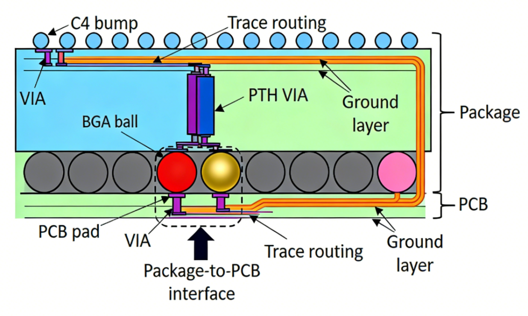对于速率接近100G的高速串并转换器(SerDes)设计,对封装到基板的传输进行建模以表征阻抗不连续性至关重要,因为阻抗不连续性会导致信号出现反射和串扰。BGA焊球图中充足的地连接有助于确保信号和地回流从封装到基板的平稳传输。信号从焊盘传输到布线层的过程中,每经过一层都应配备相应的地过孔(VIA)。在封装到基板的传输区域,尤其需要确保印刷电路板上所有与布线走线耦合的结构都具备良好的地连接,以避免地平面出现任何不连续性。