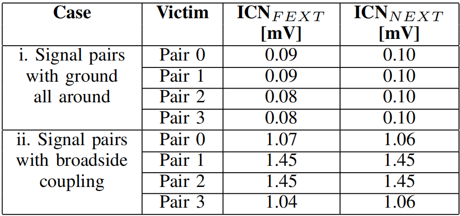 表1:工作于100G PAM4的一组串并转换器(SerDes)四通道信号对的串扰结果