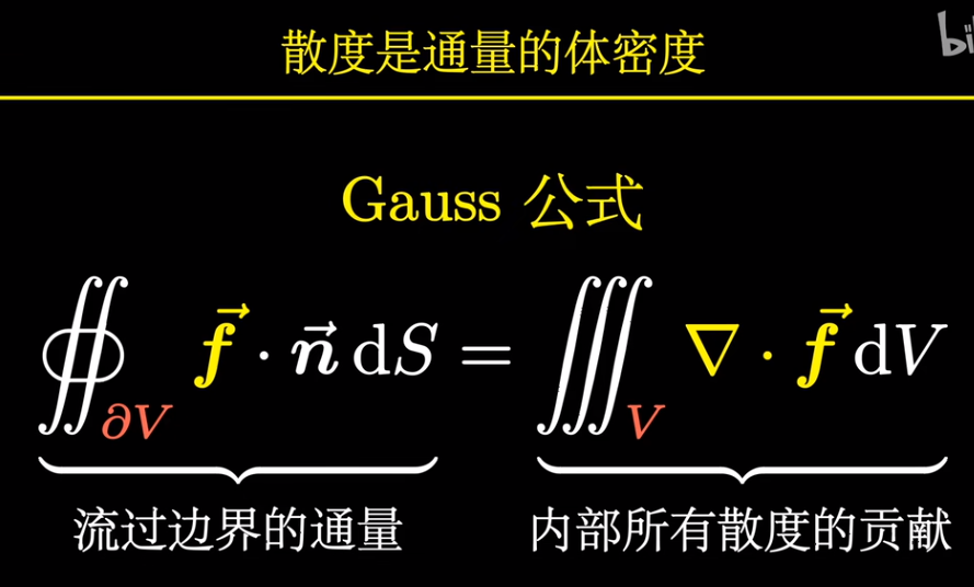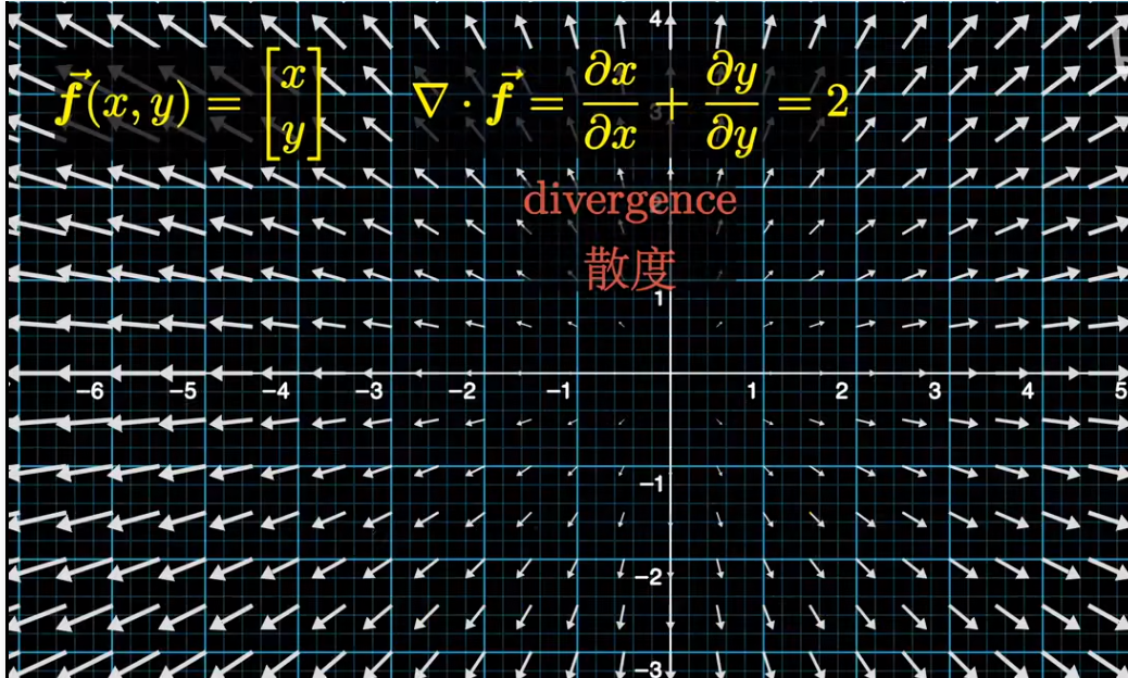 举个例子, del 与 矢量f 的点乘 得到2 ,即散度,发散的程度。