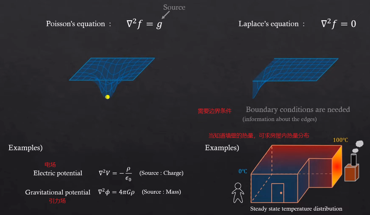 拉普拉斯方程、泊松方程。泊松方程的右侧函数为场源。