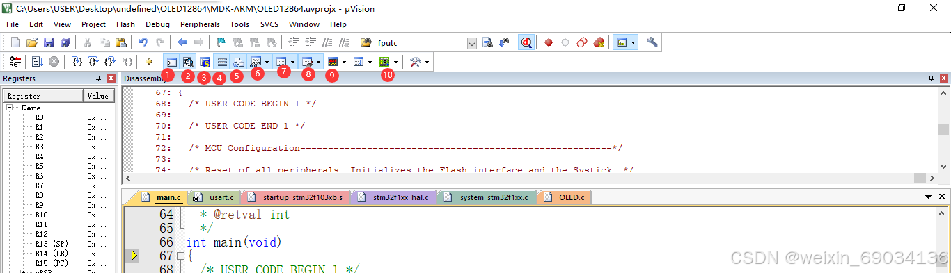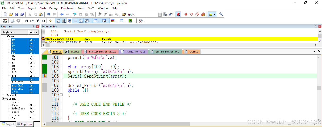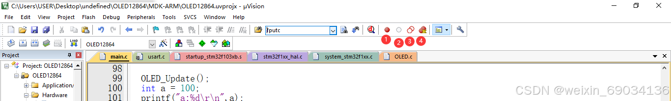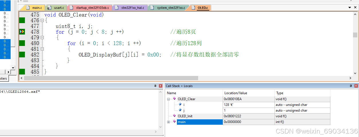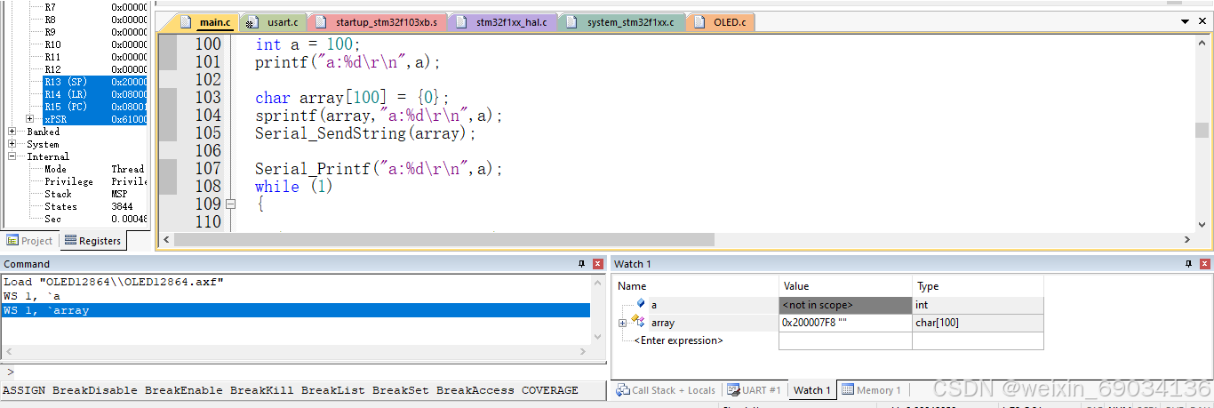 还可以通过显示屏显示调试信息,例如,利用0.96寸的OLED12864显示GPIOA端口的值。