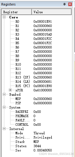 ④Registers Window(寄存器窗口),可以显示寄存器的内容, 操作模式以及系统和内部状态。