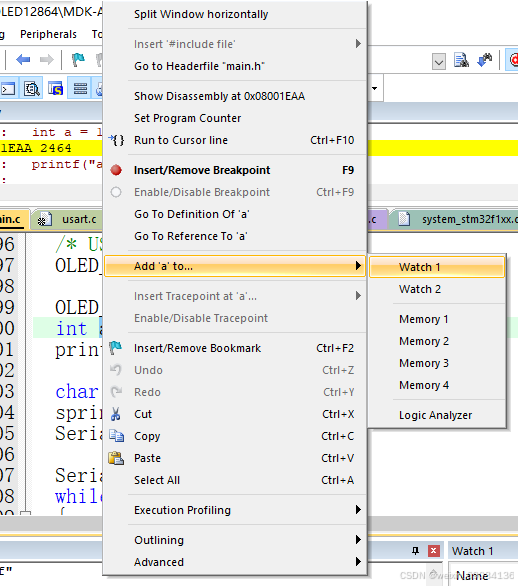添加到Watch窗口的方法:选中要添加到Watch窗口的变量,右键→Add...to...→Watch1/Watch2。