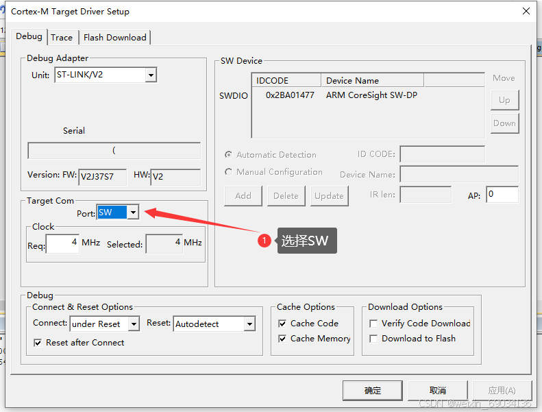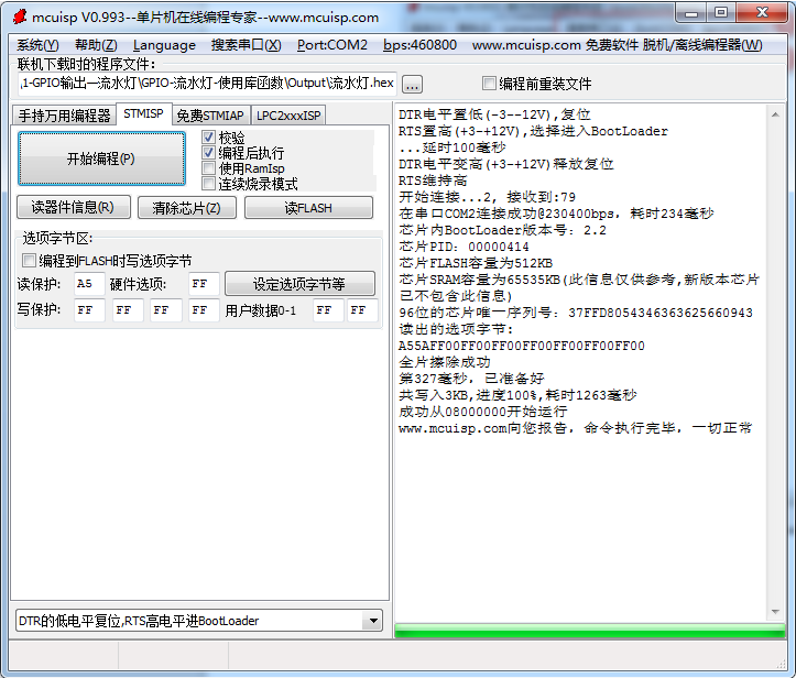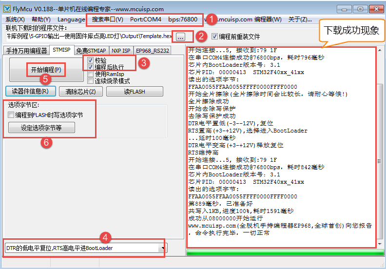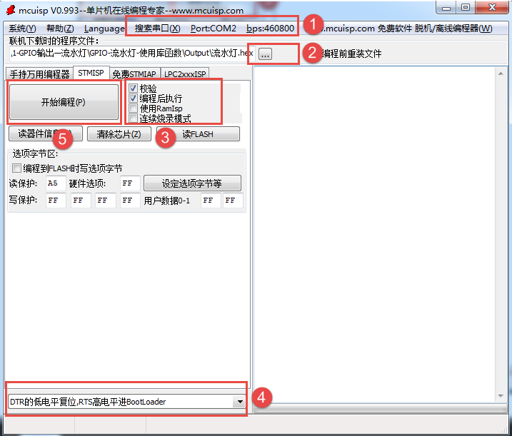 ⑤开始编程、⑥选项字节的勾去掉,如果勾选上则下载程序后不能自动运行。