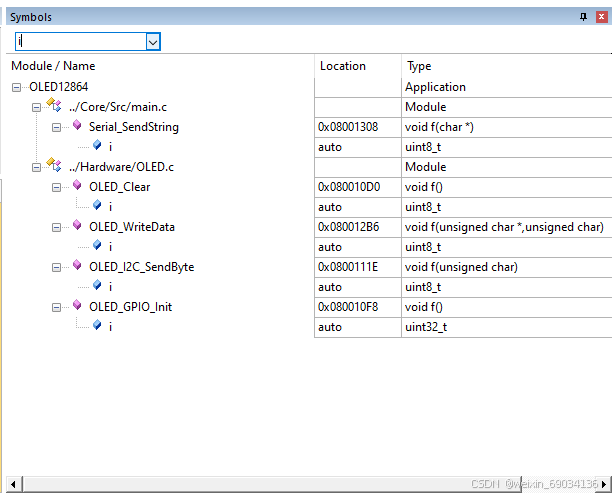 ③Symbols Window(符号窗口),可以显示标识符在内存中的位置和类型 比如,我们在其搜索框中搜索变量i,则下方就会列出其详细信息,包括它在哪个文件中,哪个函数中 。