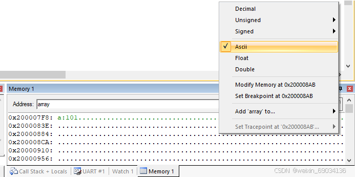 ⑦Memory Windows(内存窗口), 显示内存区域内容,可以通过右键添加到内存窗口;例如,显示数组array,一样可以修改内存中的值,还能以不同的格式显示。