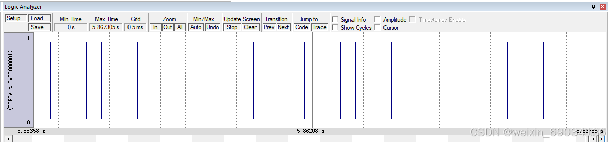 ⑨Analysis Windows(逻辑分析仪窗口),我们可以用它来显示引脚输出的波形;例如,使用TIM2的通道1输出一个PWM波,这里需要注意,要在View菜单中勾选Periodic Window Update,不然只有在程序暂停的时候才会更新波形 滚动鼠标滚轮,可以调节波形的大小,上面的图中grid的值为0.5ms,表示一格为0.5ms;除此之外,还能通过Load和Save导入或保存波形 。