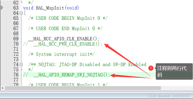 若STM32CubeMX生成的HAL库工程无法调试,则注释HAL_Init中HAL_MspInit中的__HAL_RCC_PWR_CLK_ENABLE和__HAL_AFIO_REMAP_SWJ_NOJTAG后可以正常进行调试。(在stm32f1xx_hal_msp.c文件中)。