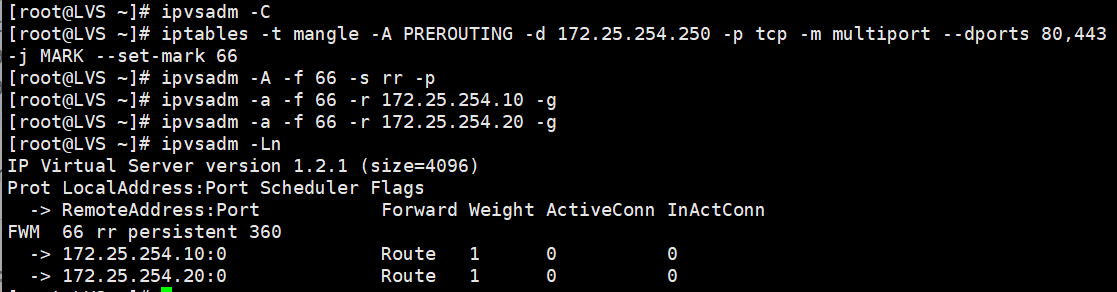 ipvsadm -a -f 66 -r 172.25.254.20 -g