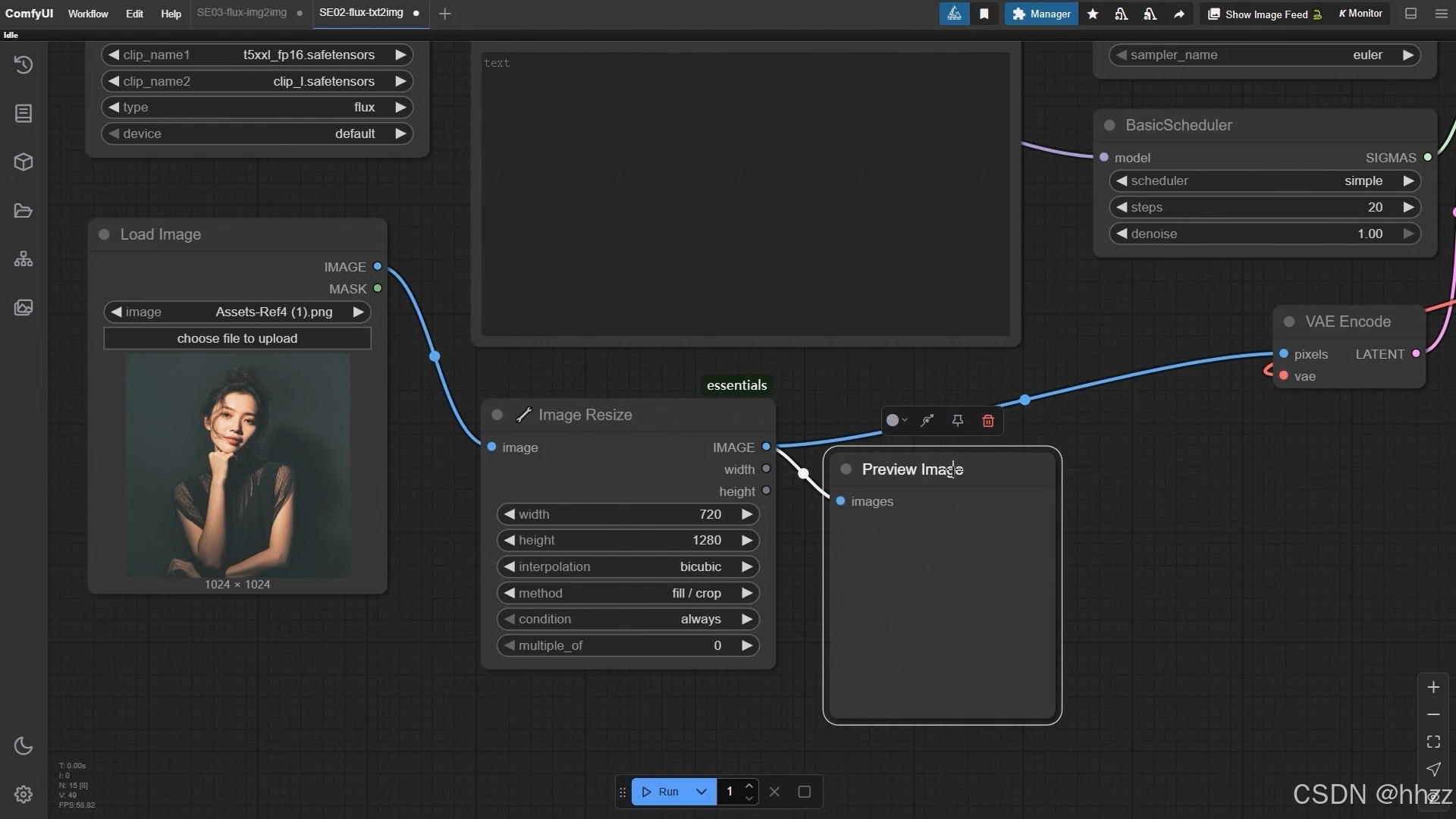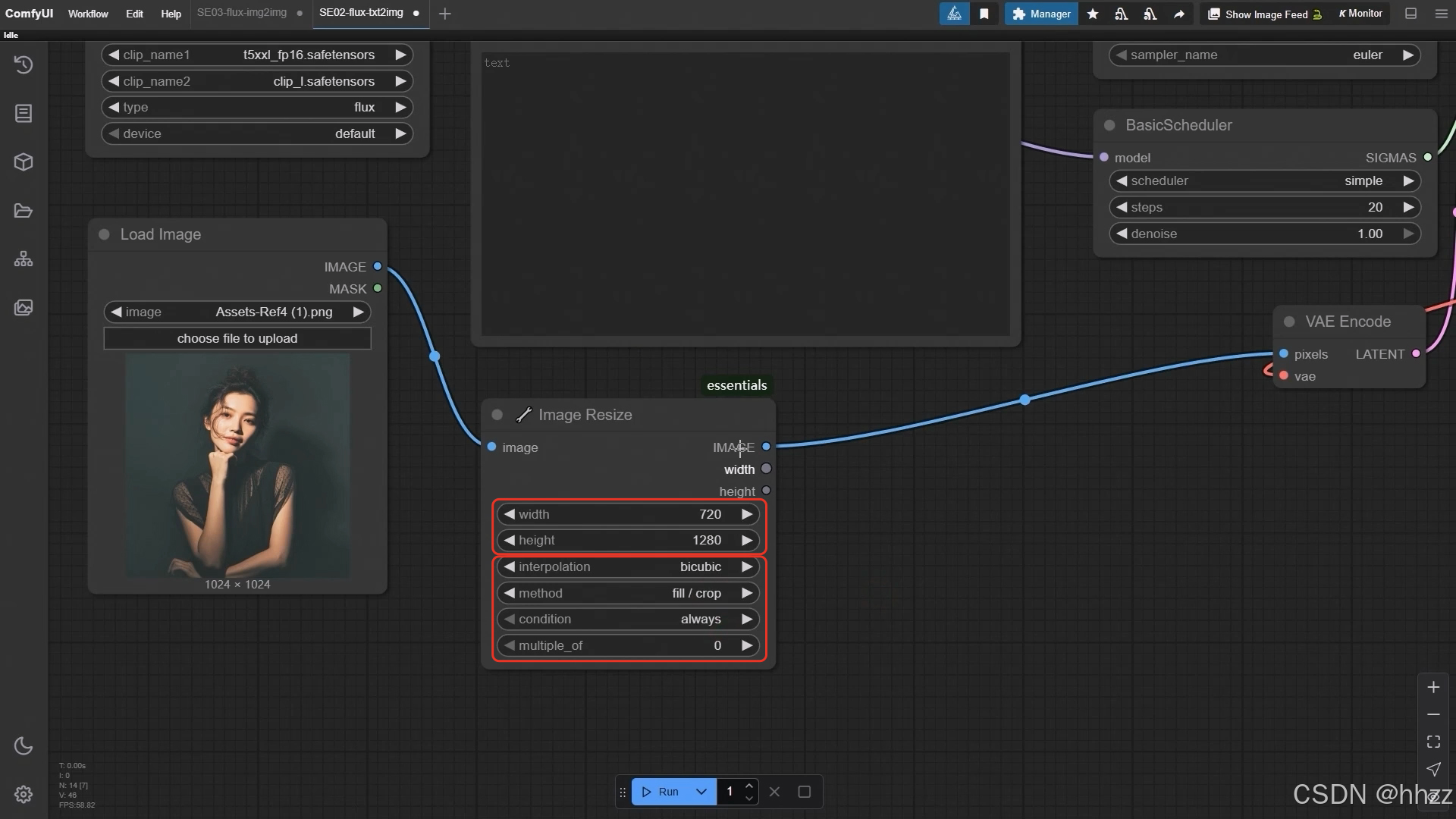 - 图像尺寸调整(可选)如果需要调整图像尺寸,可以插入一个(Image Resize)节点;设置参数时,建议尺寸(widthheight)设为7201280,插值(nterpolatior)选bicubic,方法(methoc)选fill/crop,条件(condition)设为always,乘数(multiple_of)设为0