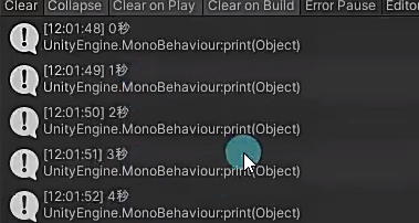 csvoid Start() { //第一次在0s瞬间执行该函数,后面每一次过一秒执行DelayFun InvokeRepeating("DelayFun", 0, 1); DelayFun2(); } private void DelayFun() { print(time + "秒"); ++time; } private void DelayFun2() { print(time + "秒"); ++time; Invoke("DelayFun2", 1); }输出结果如下: