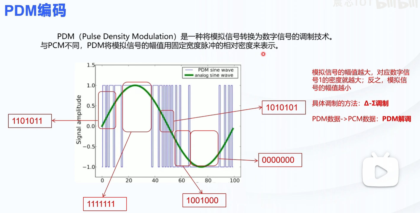 - 图 3(PDM 编码):对比 PCM,说明 PDM 用 "脉冲密度" 表示幅度,需解调为 PCM 才能使用,适合微型麦克风。