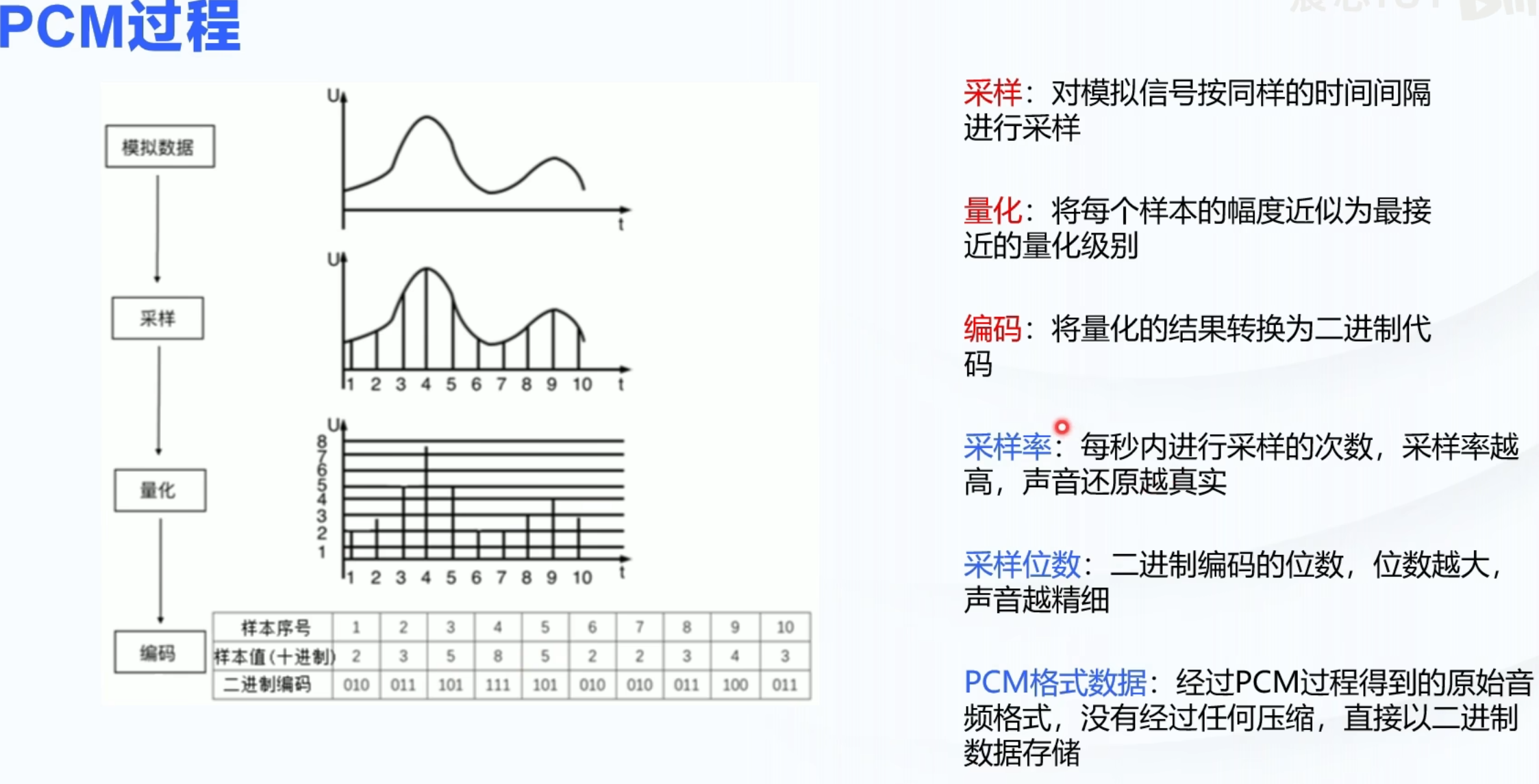 - 编码:将量化后的数值转换为二进制代码(如十进制 5→二进制 101)。