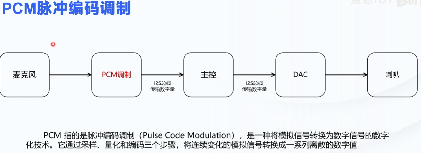 - 图 1(PCM 流程):麦克风采集模拟信号→PCM 调制(采样 / 量化 / 编码)→I2S 传主控→I2S 传 DAC→DAC 转模拟→喇叭播放。
