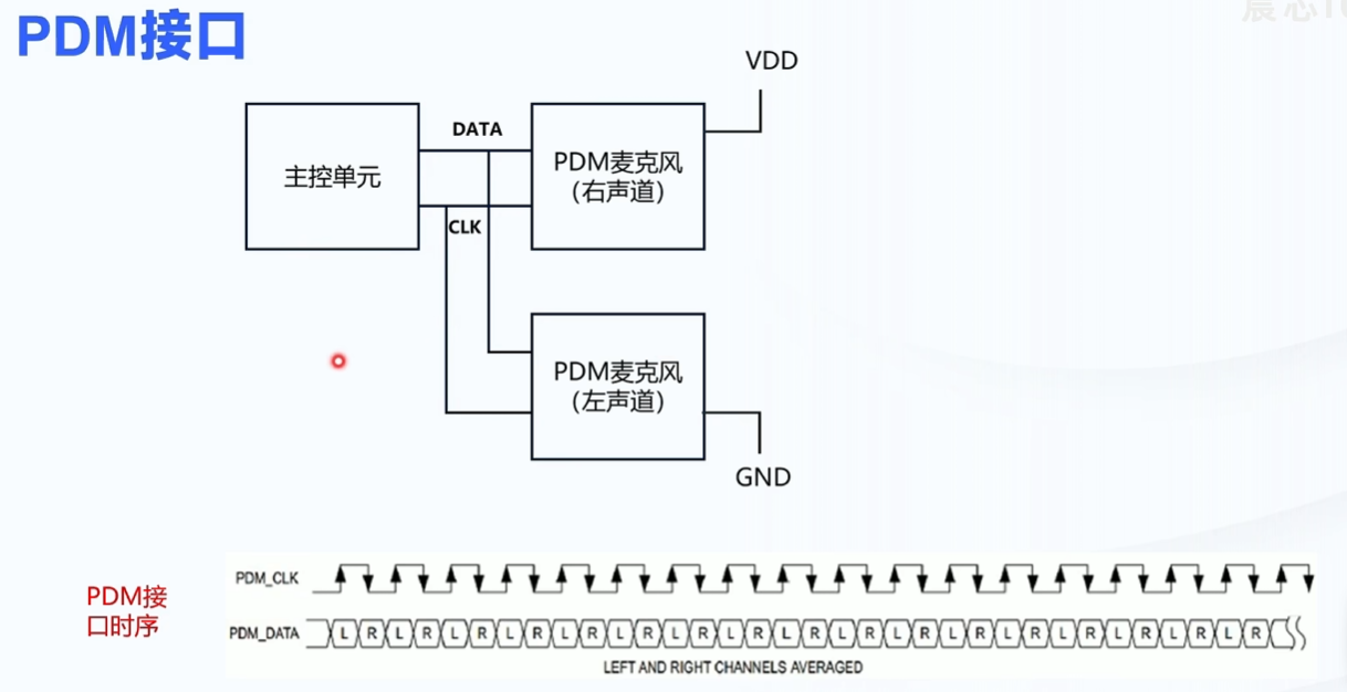 - 图 4(PDM 接口):展示主控如何通过 PDM 接口(CLK+DATA)采集左右声道的 PDM 数据,时序上通过时钟边沿区分声道。