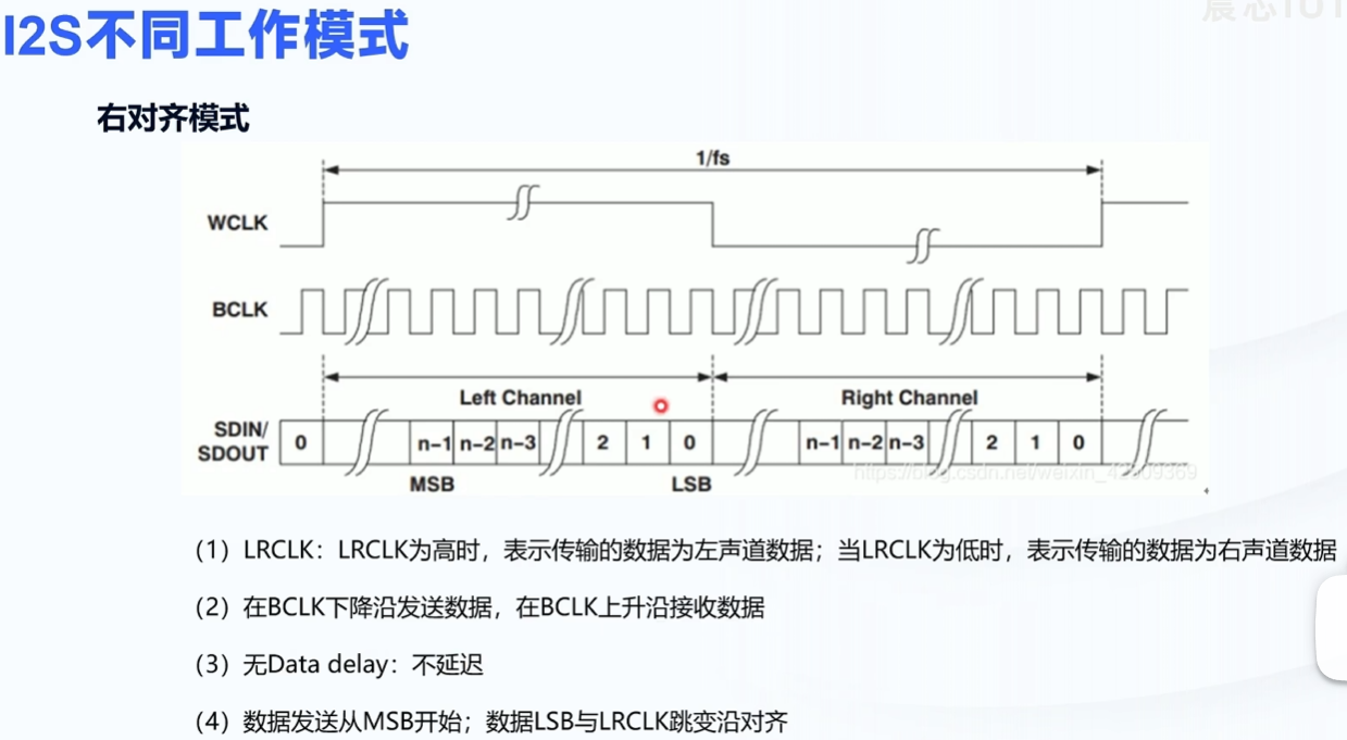 - 声道选择:与左对齐模式一致,LRCLK 高电平为左声道,低电平为右声道。